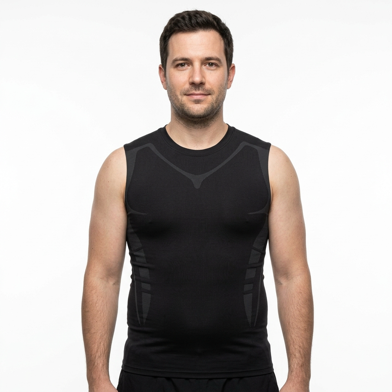 Une couche invisible qui structure votre silhouette sous t-shirt, polo ou chemise. Confortable. Discrète. Résultat immédiat.